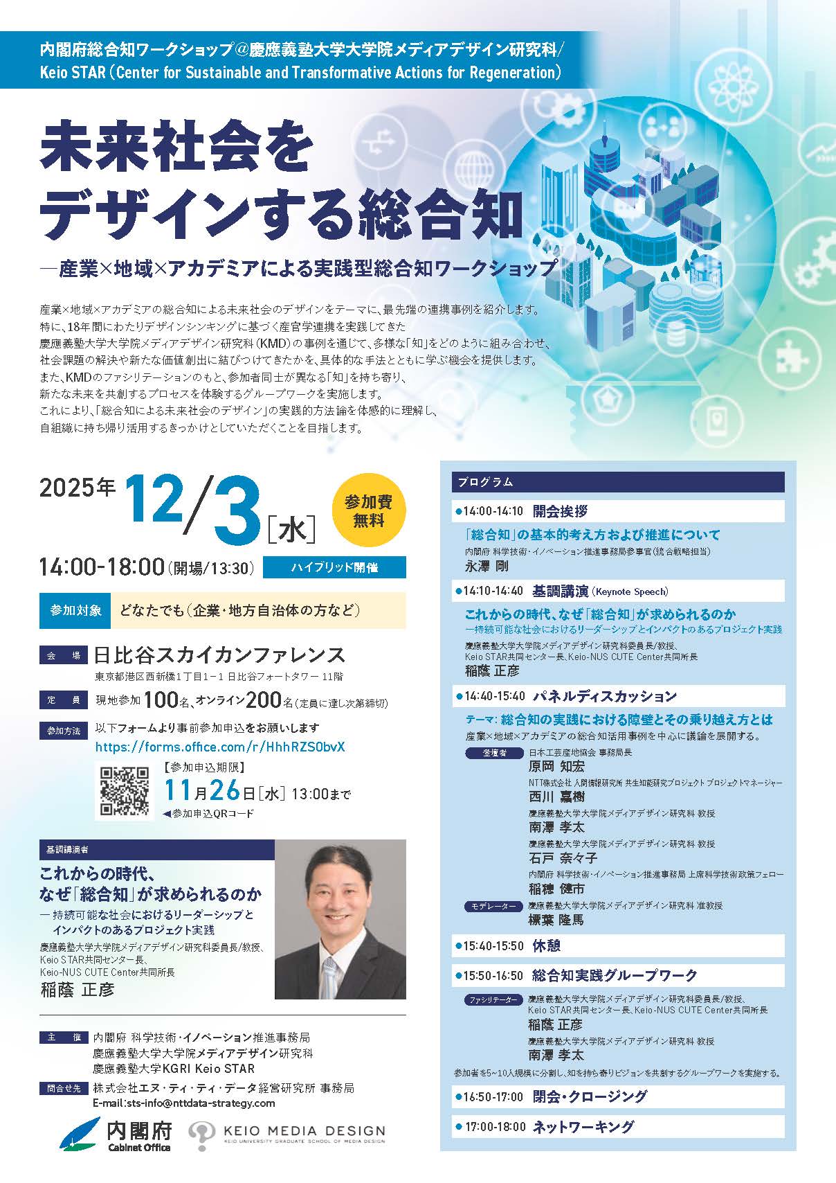 2025年12月3日(水)14:00〜18:00、日比谷スカイカンファレンスにて、内閣府 科学技術・イノベーション推進事務局との共催により「未来社会をデザインする総合知―産業×地域×アカデミアによる実践型総合知ワークショップ」を開催します。